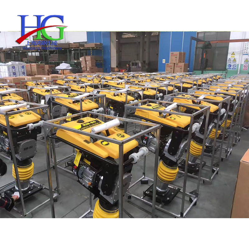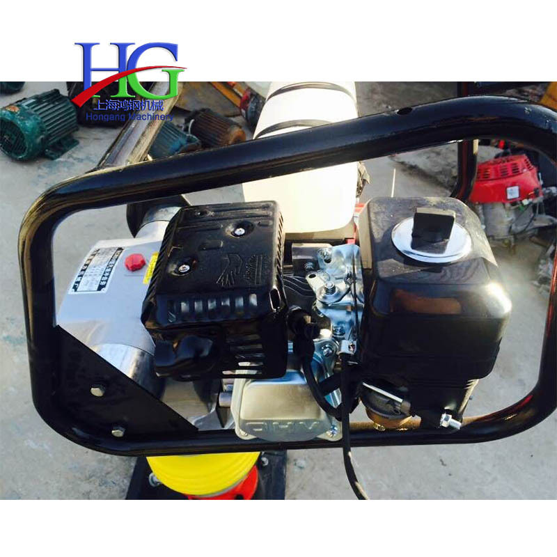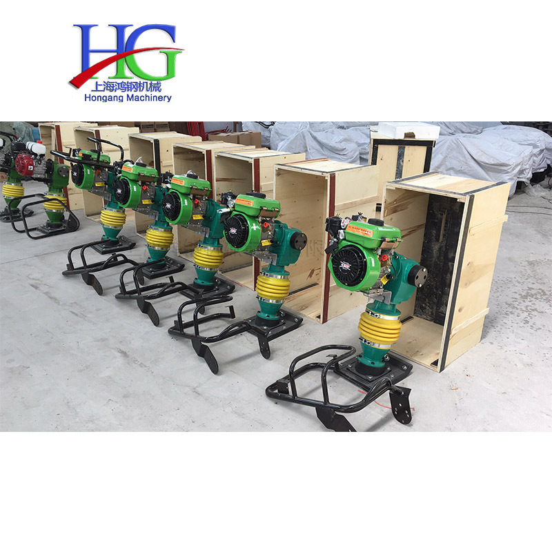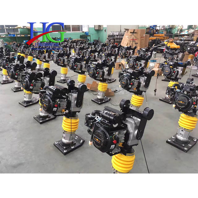 手提电动打夯机汽油冲击夯混凝土地面土层夯实机建筑路面压实夯 产品说明 该产品用途广泛,适应于建筑、地面、路基、桥桩、沟槽、野外、狭窄场地等环境的施工,能胜任大中型机械无法完成的任务。该产品具有设计合理、结构先进、噪音小、夯实力大、操作灵活、使用、适应范围广、寿命长、一机多用效率高等特点。 特点: 该产品具有设计合理、结构先进、噪音小、夯实力大、操作灵活、使用、适应范围广、寿命长、一机多用效率高等特点。本机采用加厚绝缘脂,加厚哲箱配置大夯板. 汽油冲击夯是一种冲击和冲击振动作用分层夯实回填土的压实机械。汽油冲击夯又称火力夯用于对沥青砾石、混凝土和粘土的夯实平整,特别适用于建筑、地面、庭院、路基、桥桩、沟槽、野外、狭窄场地等环境的施工,克服了电动冲击夯寻找电源拉线和没有电源不能工作的麻烦,尤其是克服了电动冲击夯带电作业对人身的不因素,能胜任大中型机械无法完成的施工任务。 汽油冲击夯的工作原理: 按二冲程内燃机原理制成,汽缸内有上、下两个活塞,上活塞是内燃活塞,下活塞是缓冲活塞。汽缸下部套装有倾斜底面的夯锤,使汽缸竖向轴线朝前偏斜。上活塞杆从汽缸顶盖中间的通孔伸出,下活塞杆从汽缸下端面伸出,并与夯锤联成一体,汽缸与夯锤之间以弹簧拉紧,并设有扶手以控制夯土机的前进方向。火力夯在可燃混合气的燃爆力作用下,因此,朝前上方跃离地面,并在自重作用下,坠落地面夯击土壤,夯锤一跃一坠,机身就步步前移。 汽油冲击夯特点和优势: 1冲程可调,可压实不同的土壤及沥青路面。 2大型封闭式空滤系统,易于清洁,发动机不易受损。 3特制的消音罩可减少发动机和底板所产生的噪音传给操作人员。 4减震式导向手柄可降低操作者的疲劳。 5球墨铸铁制成的底板具有更长的使用寿命。 6全密封,飞溅式润滑冲击系统,确保零部件润滑可靠。 汽油冲击夯技术规格: 汽油冲击夯型号HCR90 型冲击次数:(600-700)次/分跳起 高度:400-500mm 汽油机功率:(4KW)5.5Ps 冲击能量:56N.m 整机质量:90Kg