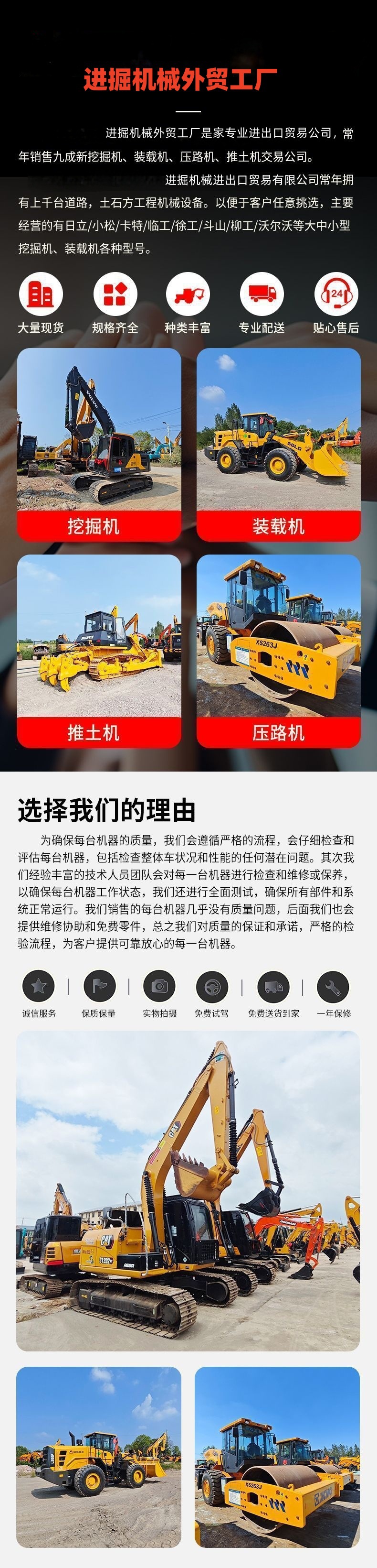 我公司专业从事国内外进出口贸易。我们的客户遍布东南亚、中东、非洲、南美洲、亚洲以及“一带一路”沿线的发展中国家。我们是一流的供应商,在上海、广州、福建、山东、河南、安徽等热门机械出口城市拥有60多家国内代理商。我们也是这些代理商的源头工厂以及货源保障工厂。我公司产品质量有保障,产品种类齐全,涵盖挖掘机、小型挖掘机、工程卡车、搅拌车、压路机、平地机、装载机、推土机、摊铺机、叉车等等。品牌:CAT、小松、日立、三一、久保田、丰田、徐工、柳工、临工等如果您从事相同行业或者正在寻找工程机械,那么恭喜您。别再错过了,质量有保障,价格在同行业中最低。合作共赢能让我们走向全球,助力兄弟企业,帮助外贸公司取得成功。未来必定属于您!